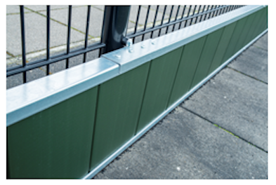 Het basis materiaal voor het kunststof onderdeel is oud kunstgras en wordt hier milieuvriendelijk hergebruikt, in kunststof verticale messing en groef delen circa 20 cm breed verticaal , en 40 mm dik, en wordt opgesloten in het frame, van Magnelis staal ! Door de unieke samenstelling metaal, zink, aluminium en speciaal magnesium gehalte wordt een stabiele beschermende laag aangebracht met zeer lange corrosie werende periode, en heeft op de snijranden een zelfherstellende bescherming. Door minder benodigd zink is het beduidend milieuvriendelijker dan de standaard zink methode. Een metaal product van Arcelor Mittal (FR).