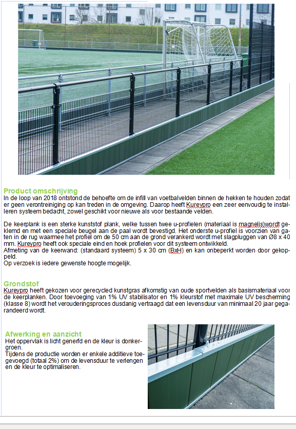 Kunststof Boording, keerwand 2022. Vanaf 2018 ontstond de behoefte om infill van spotvelden binnen de hekken te houden, zodat er geen vervuiling kan optreden in de omgeving, Kureypro heeft daarin ontwikkeld een systeem van kunststof Kunststof keerwand uit gerecycled kunstgras, met Magnelis ( Metaal) frame met unieke eigenschappen, in standaardhoogte 20 cm, en dikte van 5 cm, elke andere hoogte is uiteraard mogelijk!