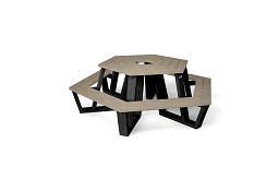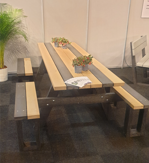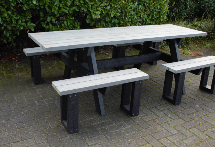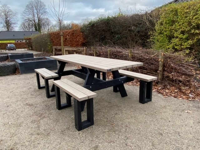 Picknicktafel als eerste afgebeeld met vier vaste dubbele banken voor 8 personen in diverse kleur combinaties ! Breedte 240 cm, hoogte 78 cm, diepte 152 cm rechte hoeken, blad en banken voor gemonteerd
